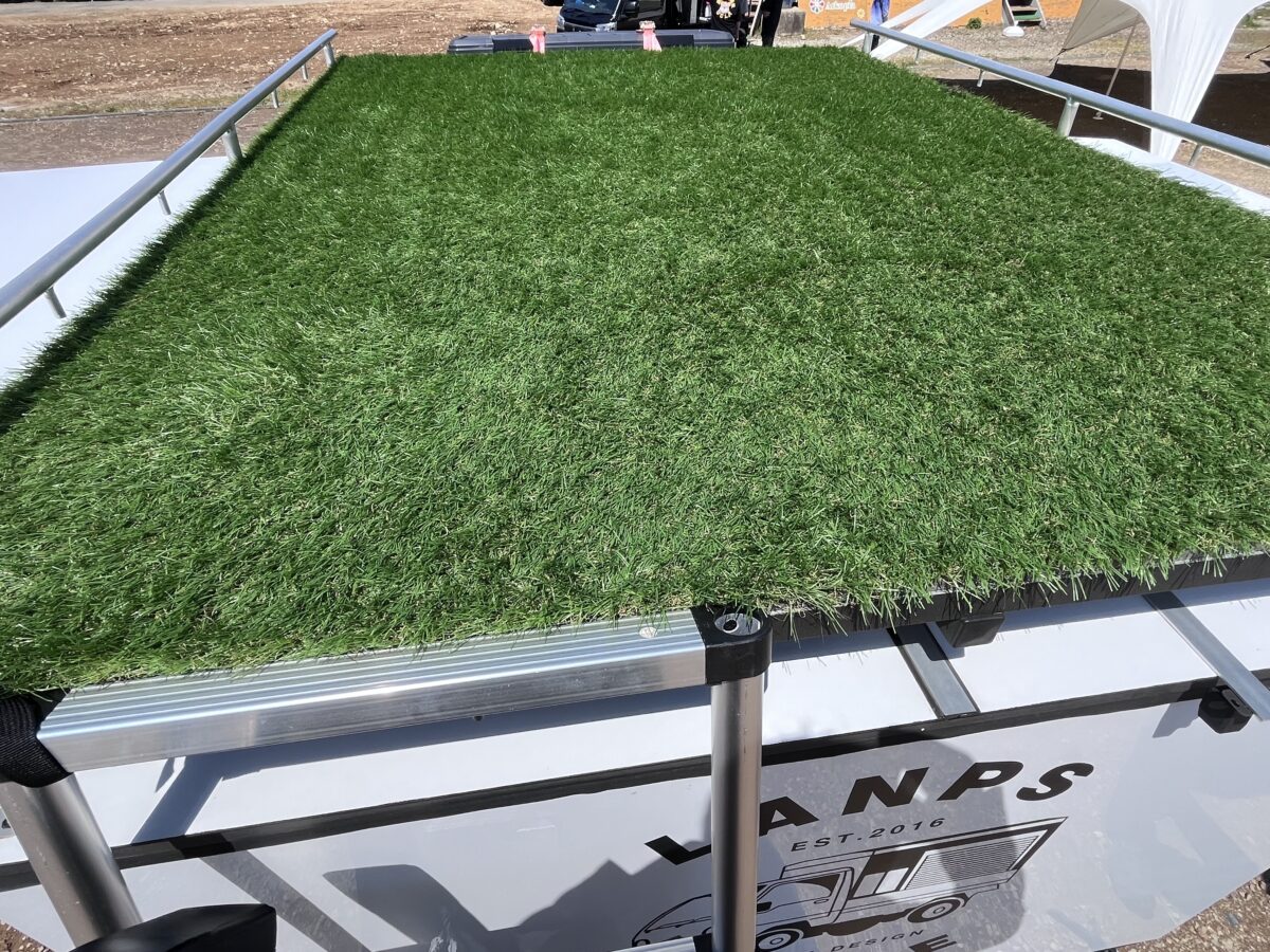 「カーゴボックス上部に敷いた人工芝です。この上にツェルトを立てて寝ることもできます。日本一周中に3回くらいここで寝ました笑」
