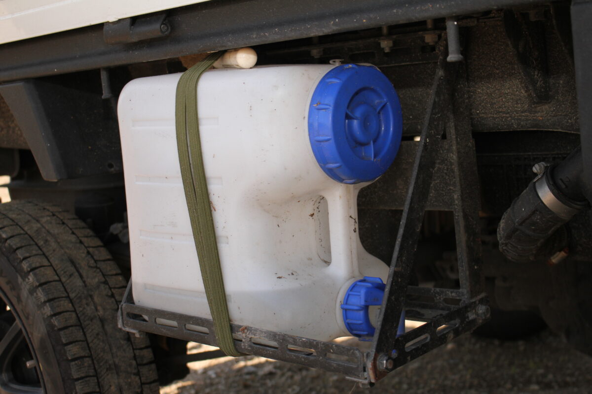 車体にタンクを増設して、湧き水を汲んでいます。それをペットボトルに小分けにして飲料用や調理用にストックしています」