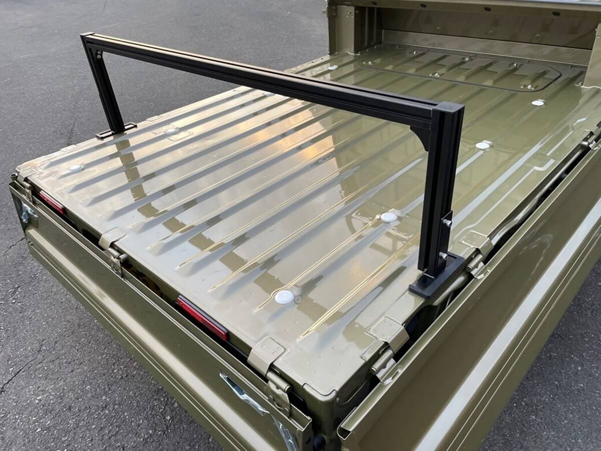 カーゴボックスの最後尾の骨組にトラレールの機構を取り込んだランプスの「トラレール・バージョン」。これにより約15分でカーゴボックスの脱着が可能となる。それまでランプスを取り付けるには荷台への穴開け加工が必要だったが、トラレールの機構を使えば穴開けは不要! 「トラレール・バージョン」の登場により、新車購入時での取り付けはもちろん、すでに使っている人もトラレール・バージョンに変更することが多いという。