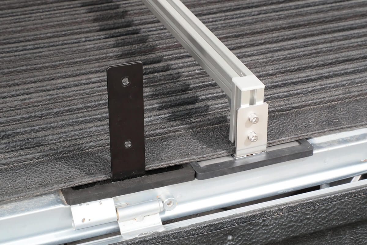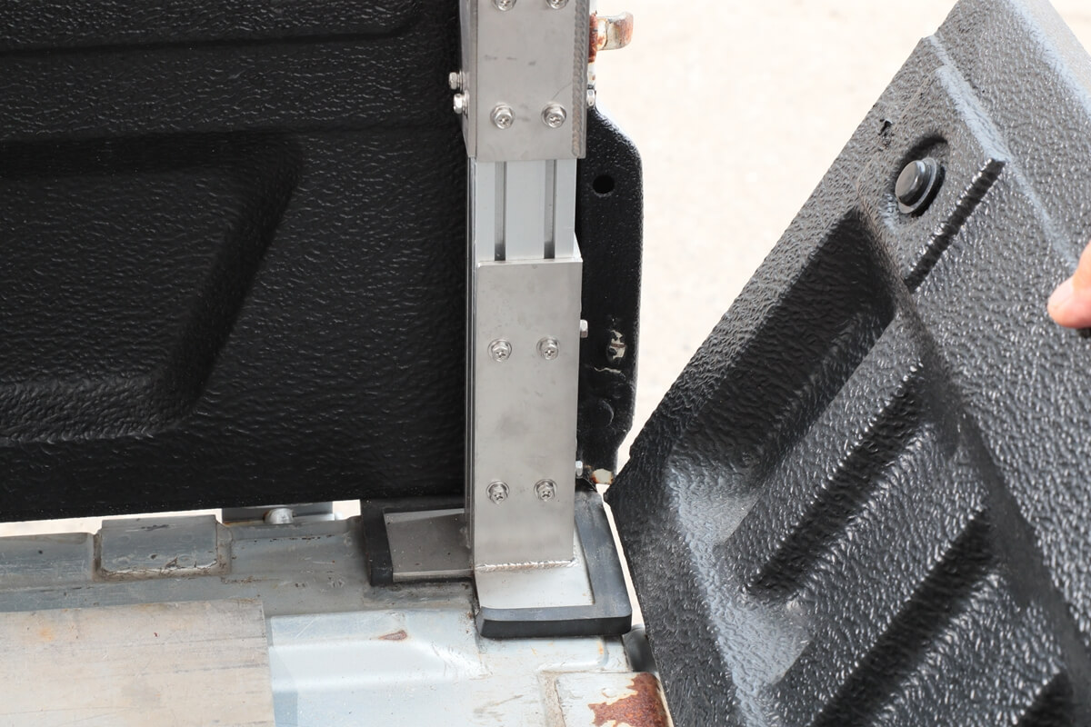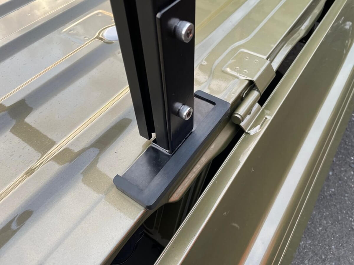 「手軽に脱着できて、軽量なキャリアをつくれないか……」。そうやって行き着いたのが、荷台のまわりにあるあおりと荷台の隙間にキャリアを挟み込むという手法だ。8mm厚のプレートに専用ゴムカバーを取り付けた土台プレートを開発。この土台プレートを、あおりと荷台で挟み込めば簡単に固定でき、あおりを開けば外れるという、トラレールの独自機構が完成した。