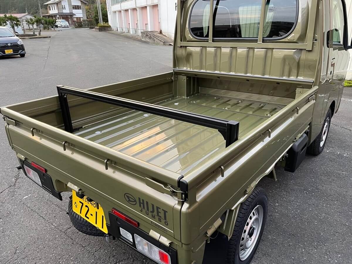 トラレールの開発には、実際に軽トラを使う人たちの声があった。荷台に長尺物を載せるために取り付けるキャリアは、一度装着したらつけっぱなしというケースがほとんど。ただ、積載する荷物によっては邪魔になるだけじゃなく、重量のあるスチール製のため、燃費や走りへの影響も大きい。取り付けの際も、荷台に穴開け加工が不可欠。加工する時間も費用もかかる。なにより新車に穴を開けるのをためらうという声も多かった。