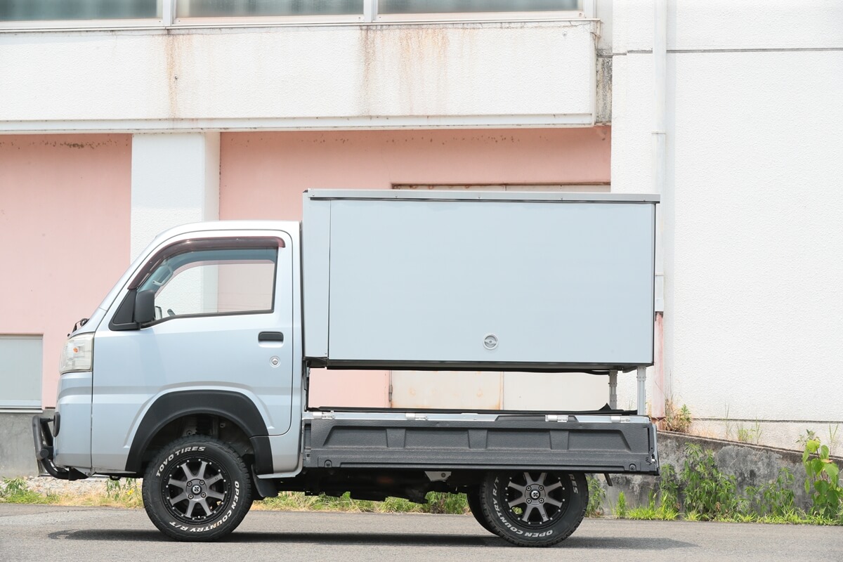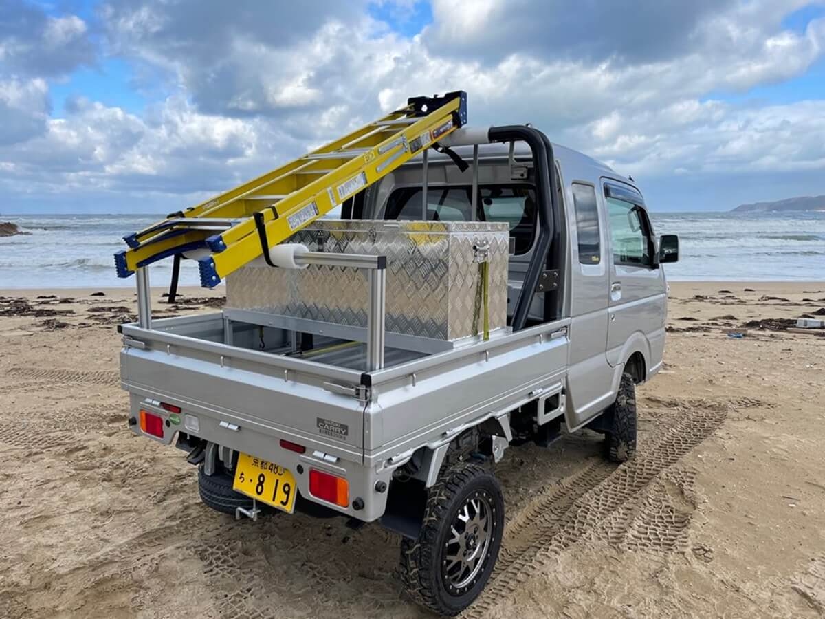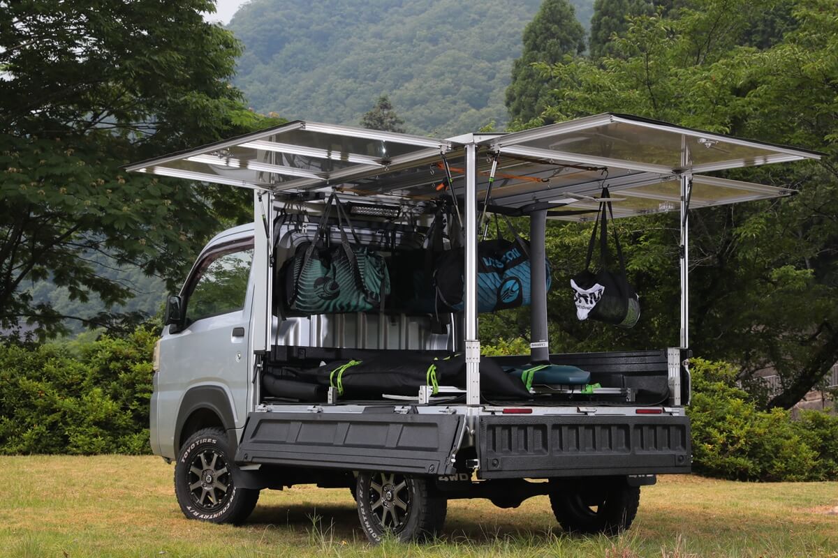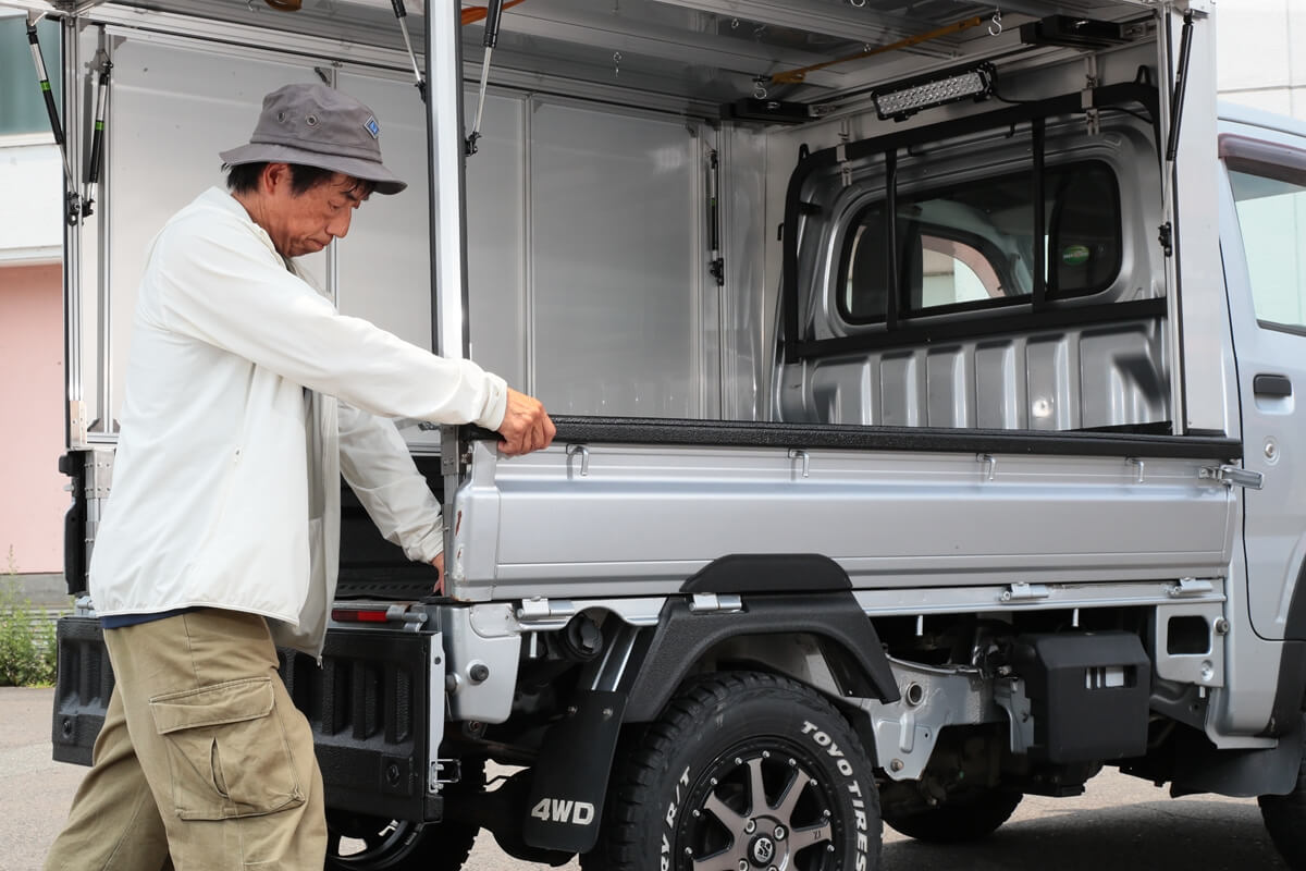 この軽トラを相棒として使いこなす人たちが注目しているのが、カーゴボックスの「ランプス」だ。アルミとステンレスで作られた軽くて丈夫なカーゴボックスは、荷台のあおりをすべて開閉でき、一般的なカーゴボックスよりも使い勝手が良いのだ。仕事から遊びまで幅広くカバーするカーゴボックスとして話題のアイテムとなっている。