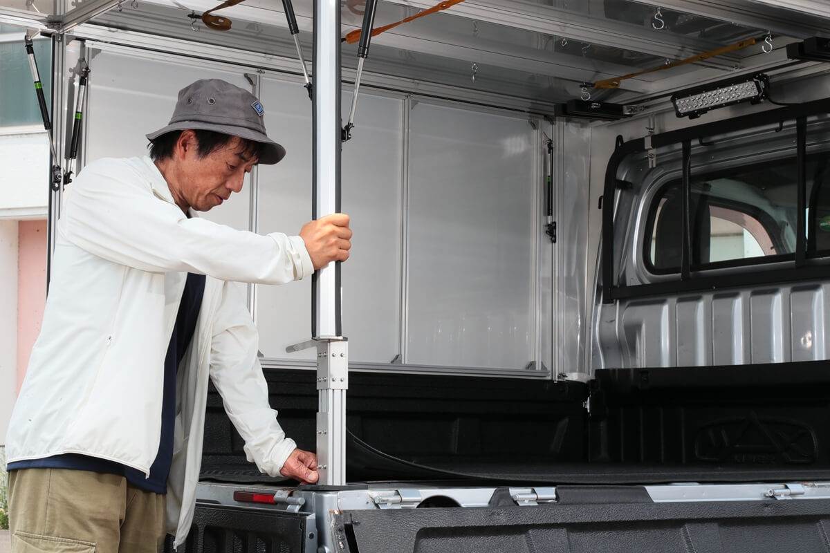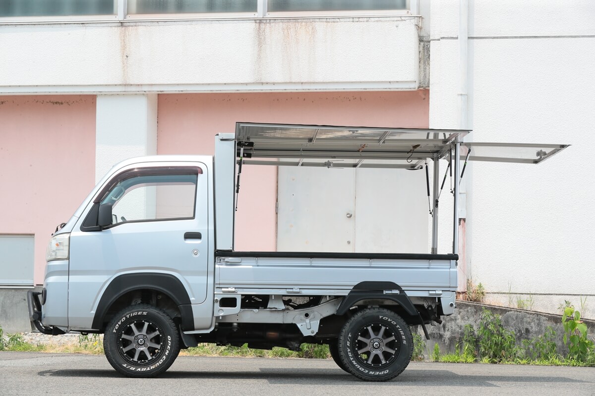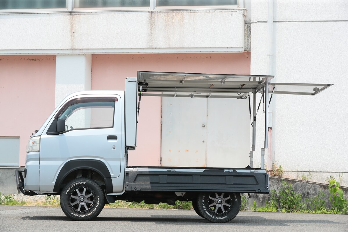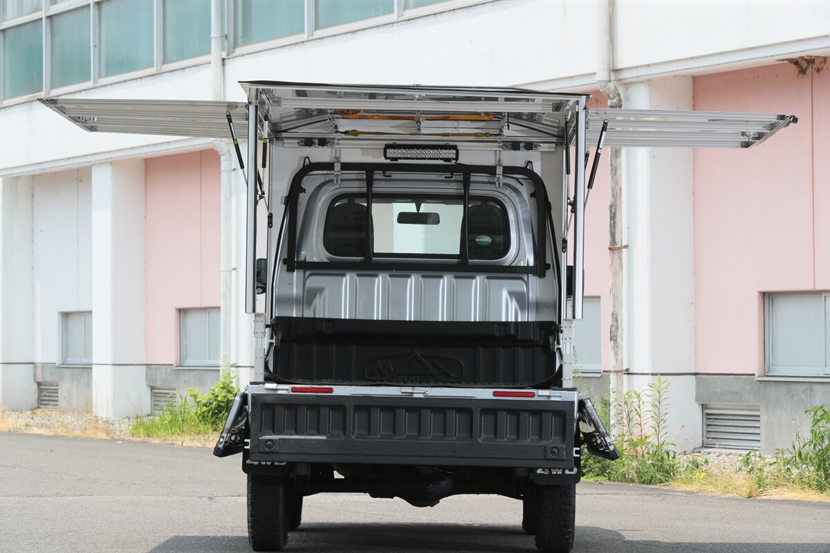 この軽トラを相棒として使いこなす人たちが注目しているのが、カーゴボックスの「ランプス」だ。アルミとステンレスで作られた軽くて丈夫なカーゴボックスは、荷台のあおりをすべて開閉でき、一般的なカーゴボックスよりも使い勝手が良いのだ。仕事から遊びまで幅広くカバーするカーゴボックスとして話題のアイテムとなっている。