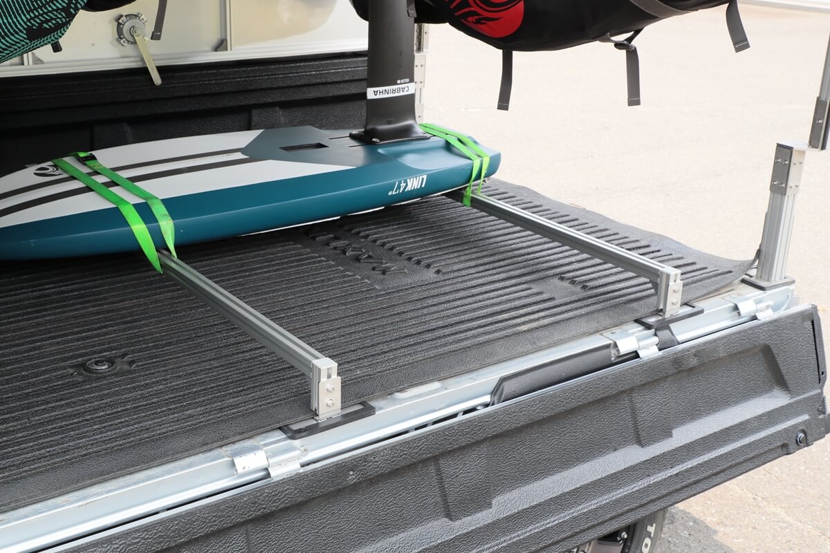 例えば、マリンスポーツのウイングフォイルの道具を載せるケース。ボードから長く伸びるフィンを運ぶには、毎回のように分解と組み立てをしないといけなかったが、高さを抑えたトラレールを2つ取り付けることで、ボードを逆さまにして伸びるフィンを上に向けて配置できる。