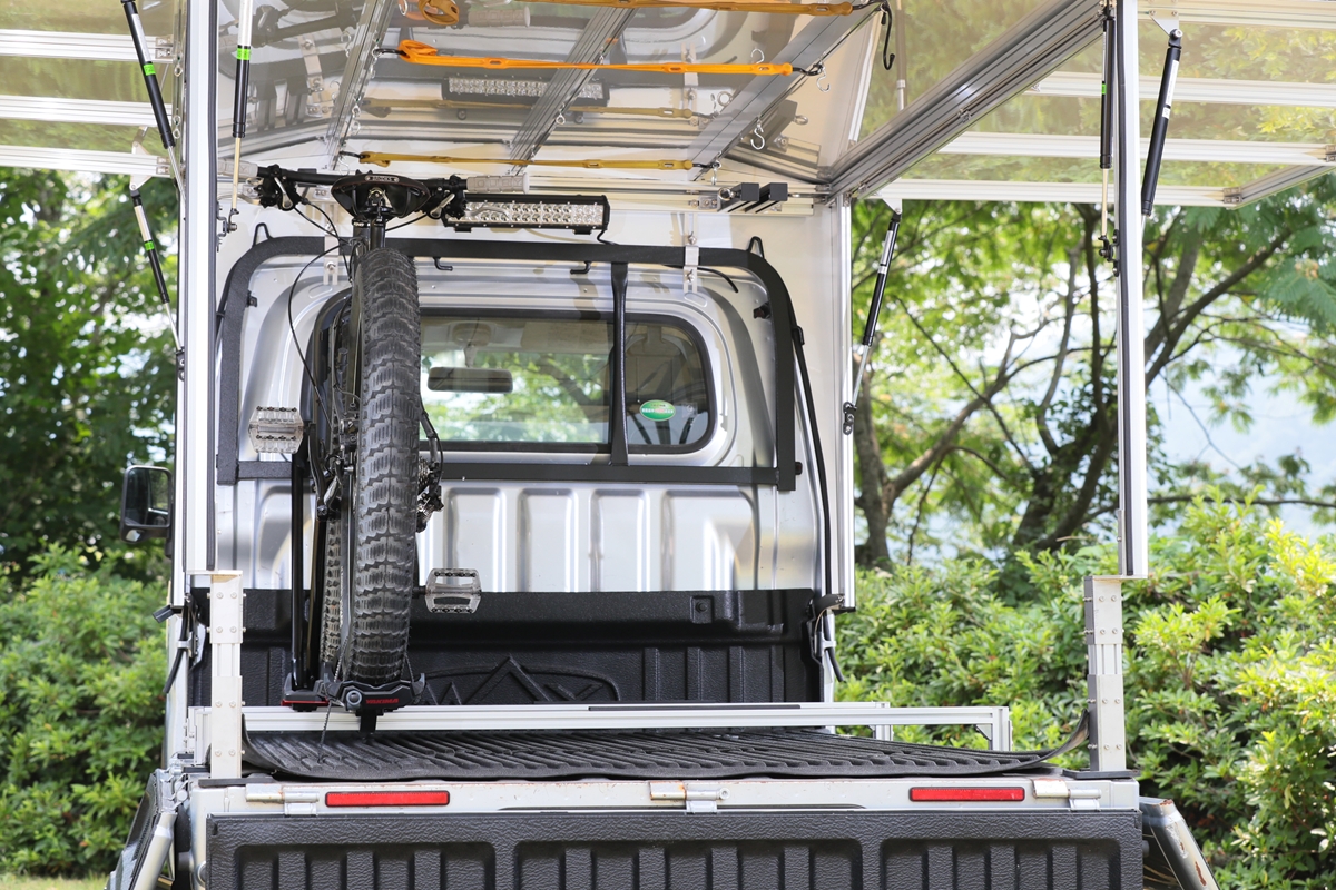 荷台のあおりを立ち上げるだけでキャリアをガッチリと固定するオンリーワンな機構