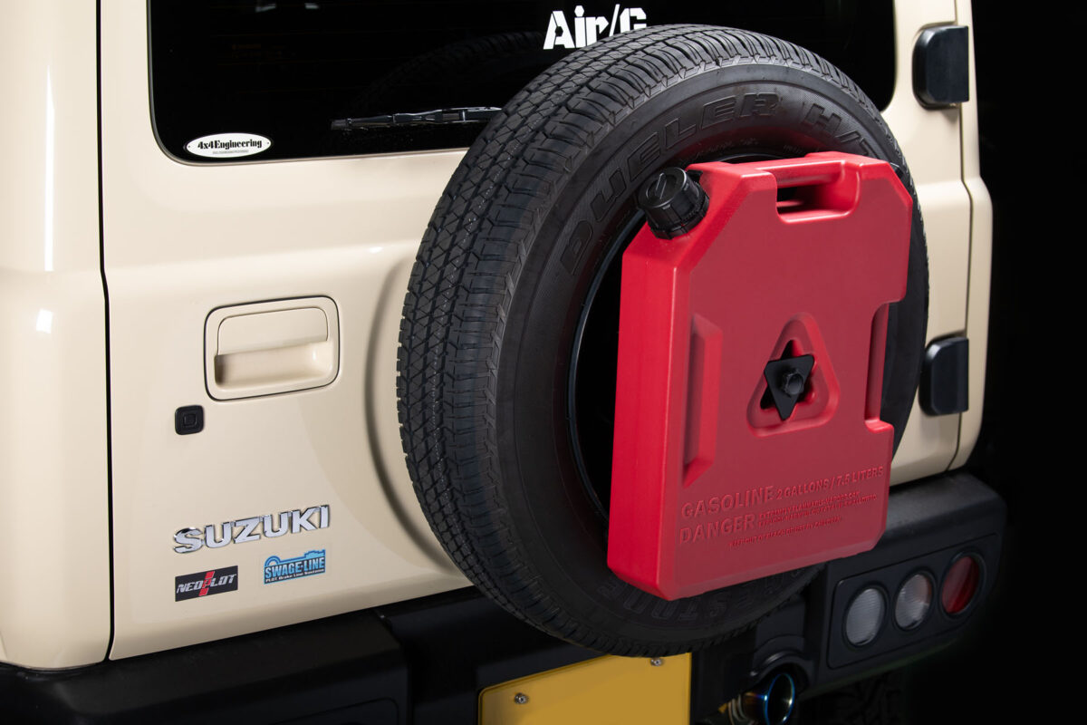 この携行コンテナには、水を保管・携行することが可能です。携行コンテナには水を出す際にスムーズに出るようにするための空気穴を設置しています。背面タイヤへの装着はNPRX-A3B1が必要です。注意:固定ノブは適宜増し締めをしてください。