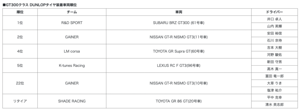 『SUPER GT第4戦富士』GT300クラスでDUNLOPタイヤ装着車両がワンツーフィニッシュ