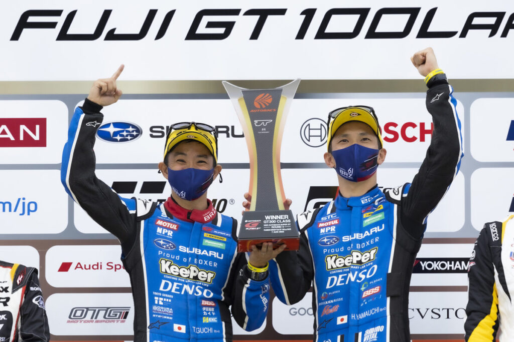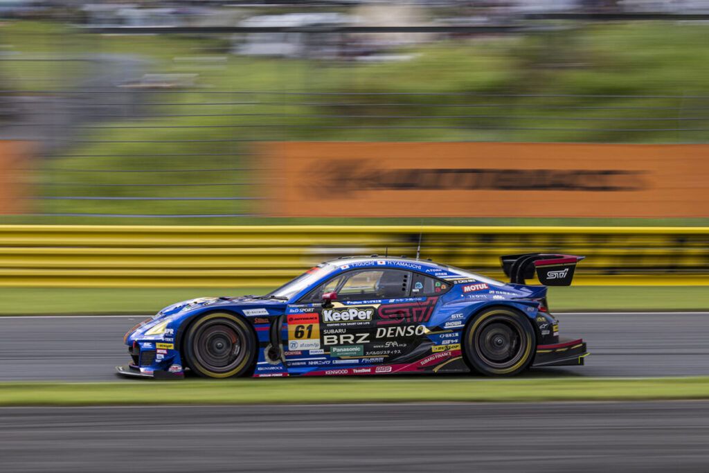 真夏のレースとは思えない想定外の低い気温かつ路面温度の中、決勝レースはスタートしました。予選2位の「R&D SPORT」の「SUBARU BRZ GT300」は、着実なペースでレース中盤まで3番手のポジションを維持。レース終盤では、DUNLOPタイヤ装着車両同士の「SUBARU BRZ GT300」と「GAINER」の「NISSAN GT-R NISMO GT3」による激しいトップ争いが繰り広げられ、最後は「SUBARU BRZ GT300」が2位の「NISSAN GT-R NISMO GT3」とは6秒の差で今季初優勝を飾りました。
