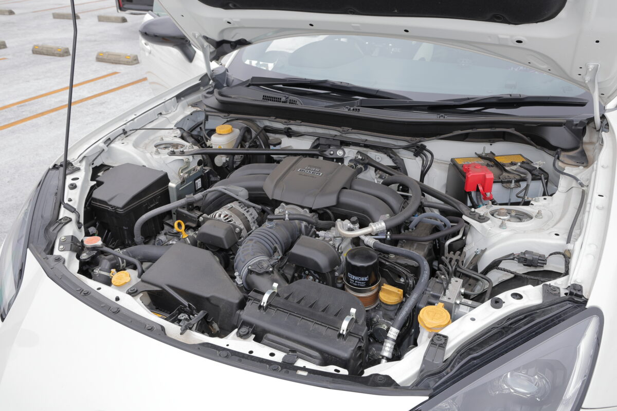 エンジンルームは特にカスタムなし。マフラーにはフジツボをチョイス。