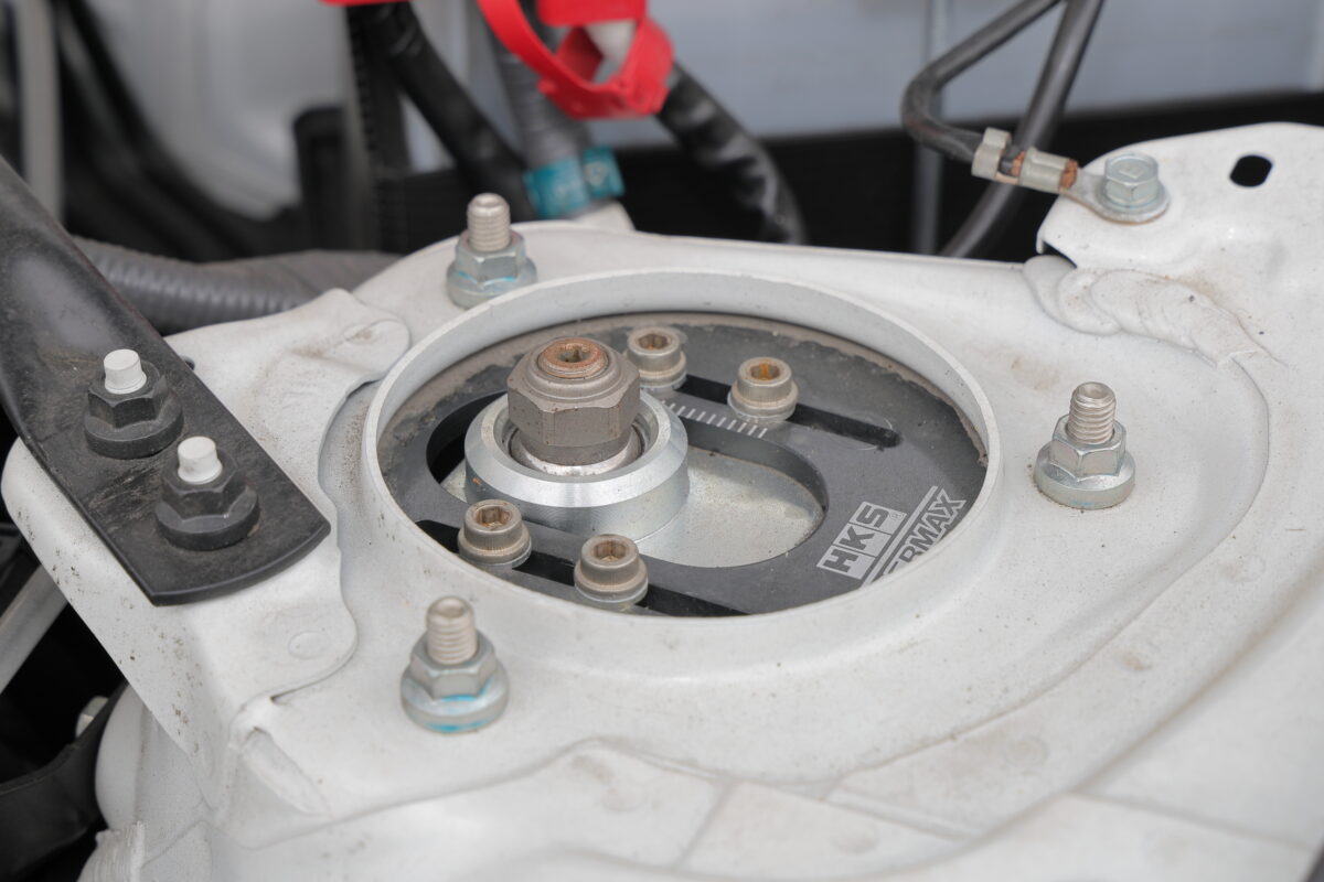 峠道はもちろん、サーキット走行も楽しんでいるお気に入りポイントはこのHKSの車高調。今後はブレーキ関連も強化していく。