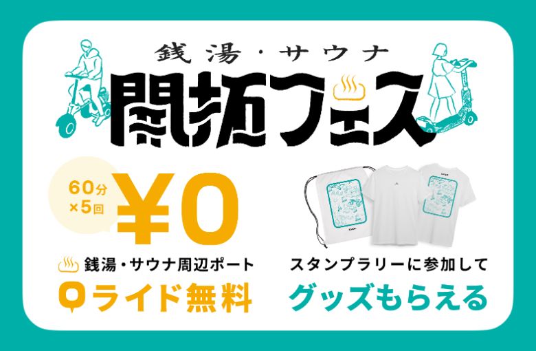 株式会社Luupは、銭湯やサウナに通うライフスタイルを盛り上げる「#LUUPで銭湯サウナ」企画を発足した。第一弾キャンペーンとして、「銭湯・サウナ開拓フェス」を9月16日(金)13:00〜9月30日(金)23:59まで開催する。東京都にある17店舗の銭湯サウナ施設付近のポートでのライドが60分5回まで無料になり、併せてLUUPオリジナルグッズがもらえるスタンプラリーを実施する。