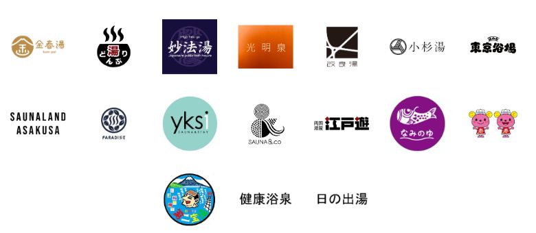妙法湯、小杉湯、サウナランド浅草、金春湯、改良湯、PARADISE、天然温泉 湯どんぶり栄湯、光明泉、東京浴場、健康浴泉、yksi SAUNA&STAY、SAUNA & co、第二宝湯、寿湯、両国湯屋江戸遊、並乃湯、日の出湯(順不同)