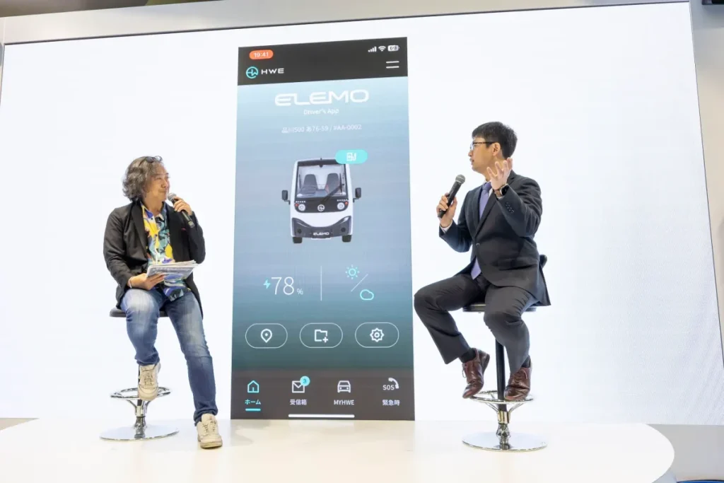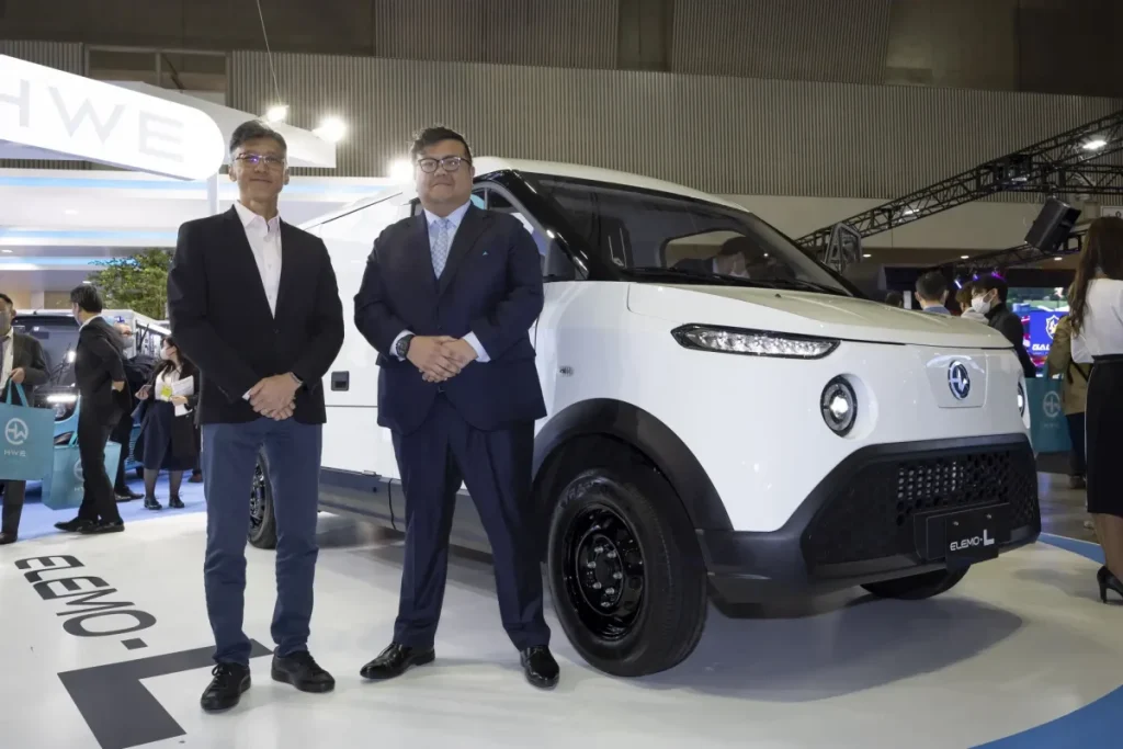 まず初めに、HW ELECTRO代表取締役 蕭 偉城とセントロオートモーティブ コーポレーション ケリー・チョウ氏より、ELEMOシリーズから新しく販売される中型EVバン「ELEMO-L」の発表を行いました。ELEMO-Lアンベールに先立ち、蕭は「このHW ELECTROブースでEVの今後の未来について、想像を膨らませていただければなと思います。」と挨拶しました。その後ケリー氏からはHW ELECTROのパートナー会社として「日本での成功は世界での成功につながると思います。これからも日本で信頼され、愛される製品を提供し続けます。」と話しました。