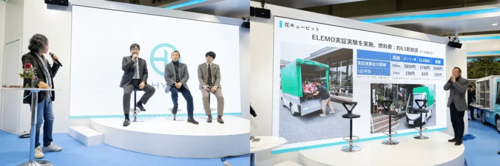 当日は、多用途EV商用車「ELEMOシリーズ」より新車種である中型EVバン「ELEMO-L」のお披露目をはじめ、新事業・業務提携に関する発表や、ELEMO活用企業とのトークセッションを行いました。