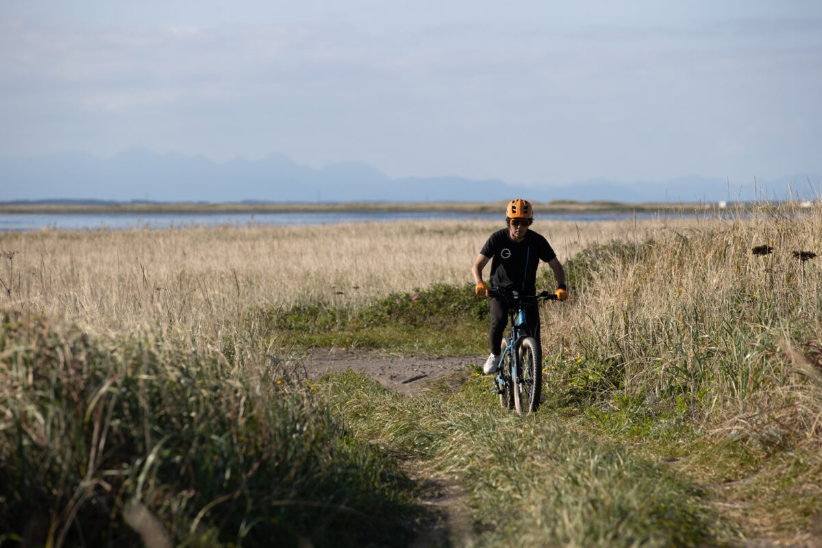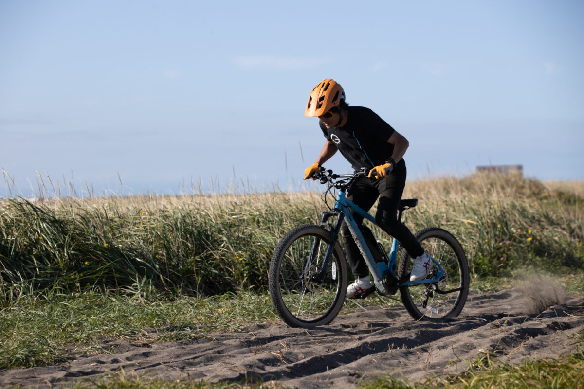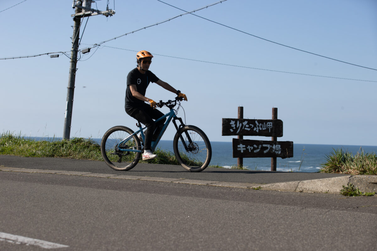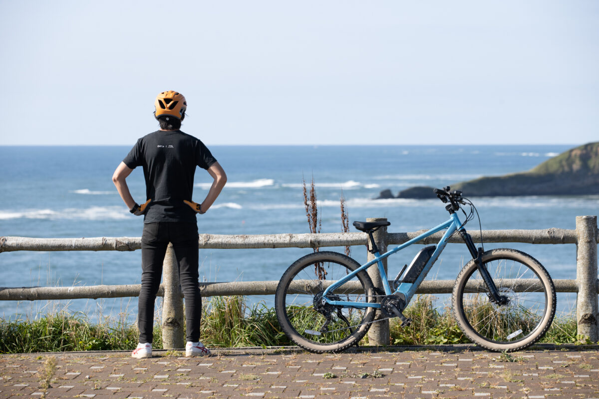 砂州なので先端付近になると舗装路が終わって砂路面になってしまうのですが、e-EDIT275なら大丈夫(笑)。通常のMTBでは砂の路面は漕ぐ気すら起きないものですが、Eバイクであれば若干難易度高めではあるものの、しっかり路面にトラクションがかかって前へ進んでくれます。そのうち走り方がわかってくると、その浮遊感がおもしろい。ロードバイクはもちろん、グラベルバイクも、MTBも砂の上は大の苦手。もしかすると、Eバイクは自転車の中でも唯一砂を楽しめる存在なのかもしれませんね!