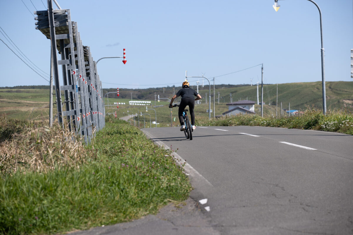 霧多布(きりたっぷ)岬は、そんな道東の良さをぎゅっと凝縮したような場所です。今回は車にe-EDIT275を積んでいるので、岬の付け根から美味しいところだけを走ってみました。ルパン三世の作者モンキー・パンチの生まれ故郷と言うことで、ルパン三世の街としてPRしている浜中町を超えて海抜60mほどの緩やかな丘を登っていきます。緩やかとはいっても、自転車で上るのはかなり大変。正直、人力だけでは「さわやか」とは言いがたいシチュエーションですが、e-EDIT275をブーストモード(最大出力)にして上ると、心拍数にほとんど変化がみられないほど楽々上りきれました。
