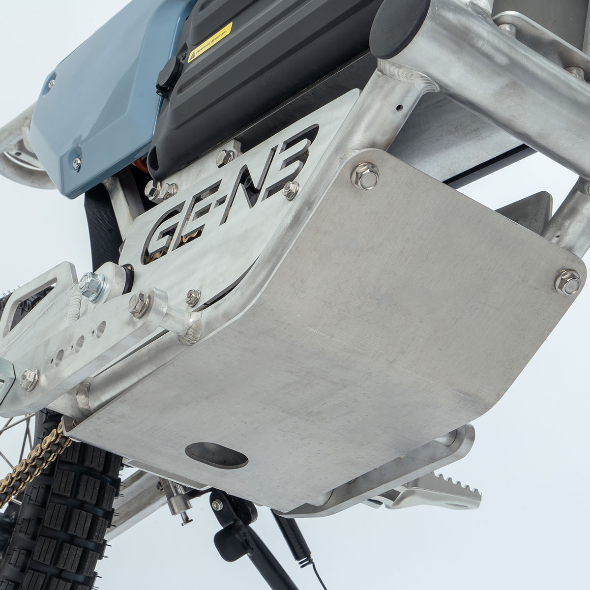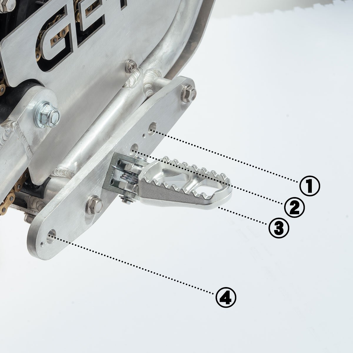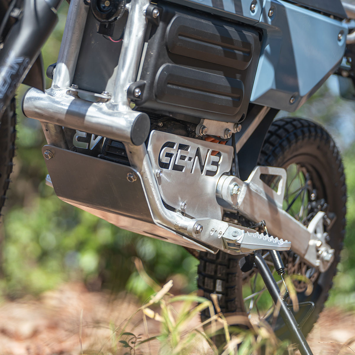 取り付け穴により、4カ所から選べるフットペグポジション。シフトペダルもブレーキペダルも無い電動バイクならではのギミックです。コンフォート志向の1~2番ポジション。フットペグ位置がホイールベースに対して6:4という一般的なオフロードバイクに近い3番ポジション。そして4番目のポジションは7:3という、トライアルバイクに近い比率です。乗車スタイルのお好みでどうぞ。