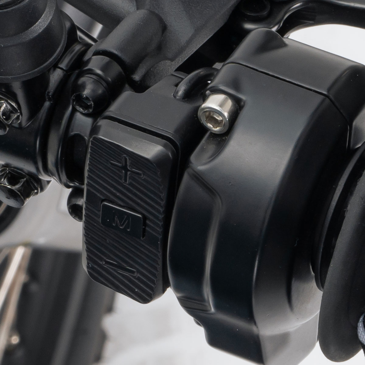 前後に対向4ポッドの油圧ブレーキを装着し、フロント203ミリ径、リア160ミリ径のブレーキローターとの組み合わせにより、車格に対して余裕のある制動力を備えます。自転車規格のブレーキですが、長めのレバーを使用し、スロットルボディやスイッチボックスが間に挟まっていても十分な長さを確保しています。