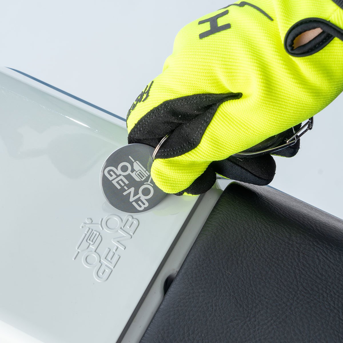 シートの前方にあるGE-N3マークにカードキーをタッチすると、電源がオン/オフされます。物理キーと違い、暗い場所で鍵穴を探す必要もなく、鍵穴へのイタズラに遭う可能性も減ります。