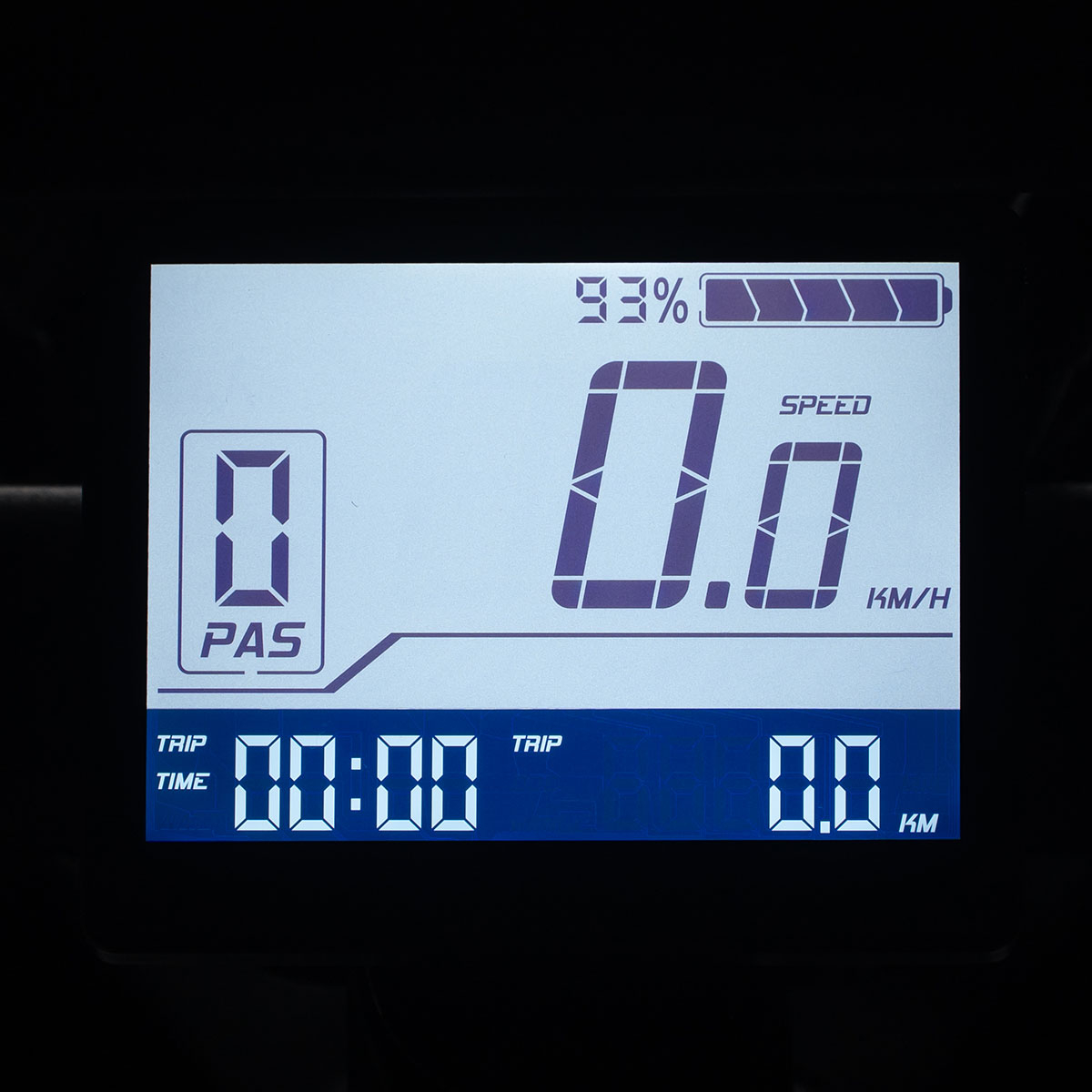 必要な情報が整理されたディスプレイ。速度、バッテリー残量、トリップメーター、オドメーター、トリップ走行時間、走行モードが表示されます。その他、故障によるエラーもここで通知されます。