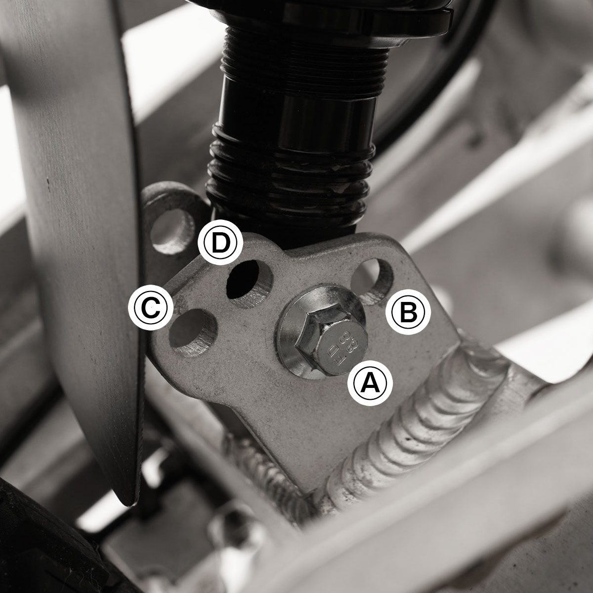 リアサスペンション下部の取り付け位置も4カ所から選ぶことができます。最もベーシックなポジション[A]に対して、地上高が約30mm上がり、キャスター角が約2度起きるトライアル車的なポジション[B]。そして、[A][B]のポジションの各姿勢のまま、リアサスペンションが少し硬めに変わる[C]と[D]のポジションです。走行シーンやライダーの体格によってアジャストしてください。