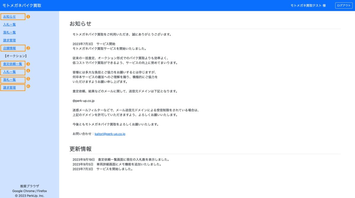 店舗の基本情報になります。こちらの内容を変更したい場合は、モトメガネバイク買取サポート係(kaitori@perk-up.co.jp)までご連絡ください。