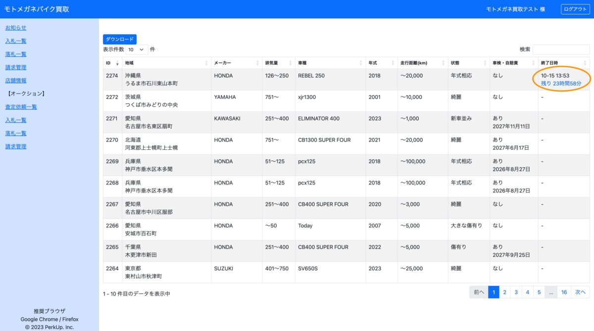 入札しているバイク一覧を確認することができます。