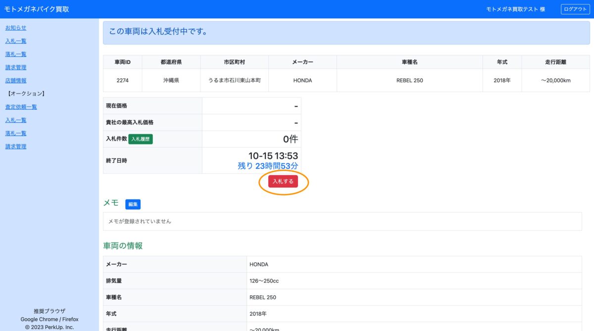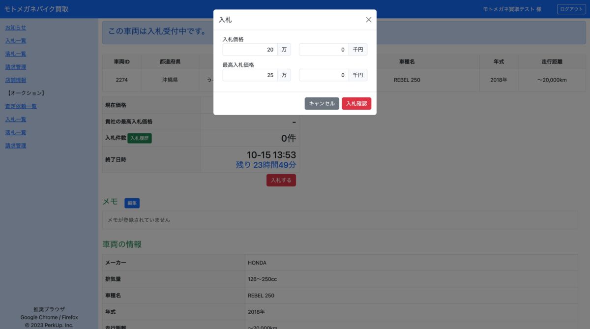 車両詳細の確認・査定入札・入札金額の変更・キャンセル
