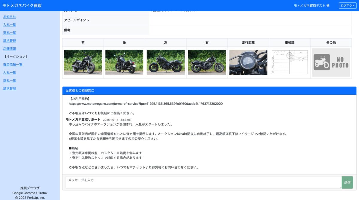 入札期間中や落札後、お客様に確認したいことがある場合は、車両詳細ページ下部のチャット欄をご利用ください。
