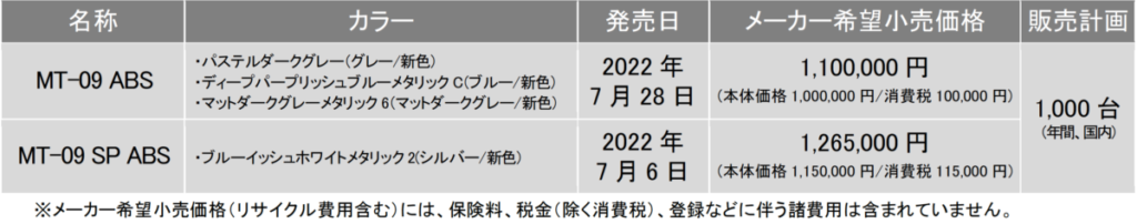 ヤマハ MT-09 ABS・MT-09 SP ABS 2022年モデルを発売