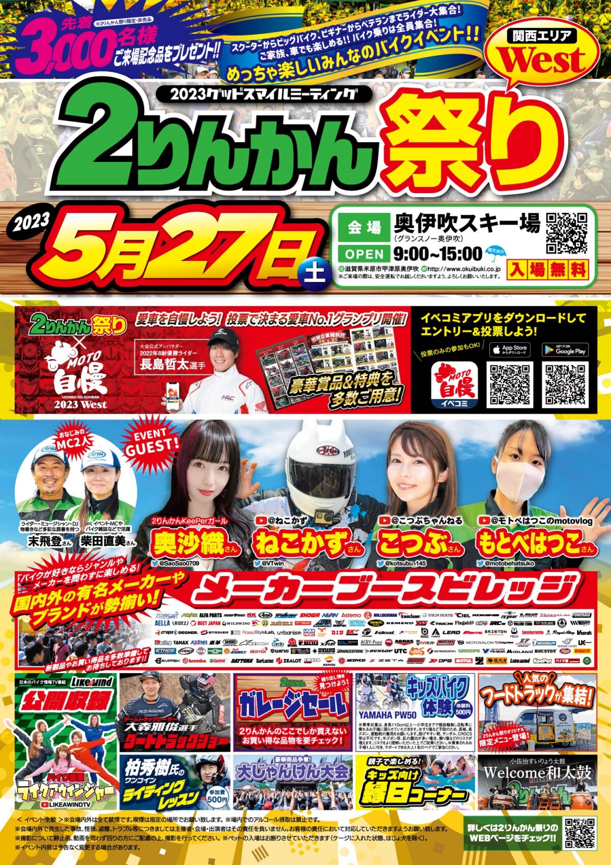 奥伊吹観光株式会社は、2023年5月27日(土)に奥伊吹モーターパーク(グランスノー奥伊吹)にて、全国からバイク5000台が集結する参加費無料の日本最大級バイクイベント「2りんかん祭り」を開催する。