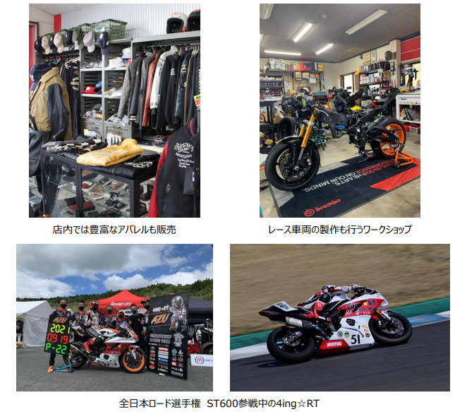 4ing Custom Pro Shopは、2輪・4輪の新車販売、中古車販売、一般整備、車検に加え、店名が示す通り“カスタム“でも有名なショップ。カスタム車両製作、レストア、カスタムペイント、レース車両製作に加え、アパレル、グッズの販売、ステッカー製作、ウエアデザイン製作、レースサポートまで対応。また、同店が運営するレース事業「4ing☆RT」は、全日本ロードレース選手権をはじめとする各種レースに参戦。活動の広さは多岐に渡ります。