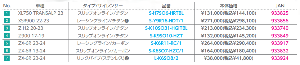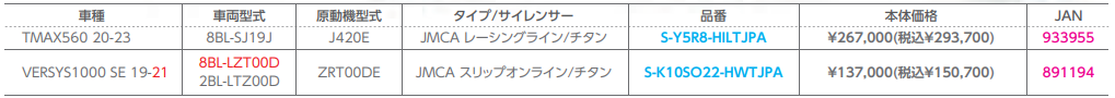 パワー、トルクともにアップする高性能マフラーで、日本国内での公道使用が認可された車検対応であるのが特徴だ。今回新発売したのはTMAX560とVERSYS1000用となる。その他、公道走行不可のレース専用マフラーも多数発売している。