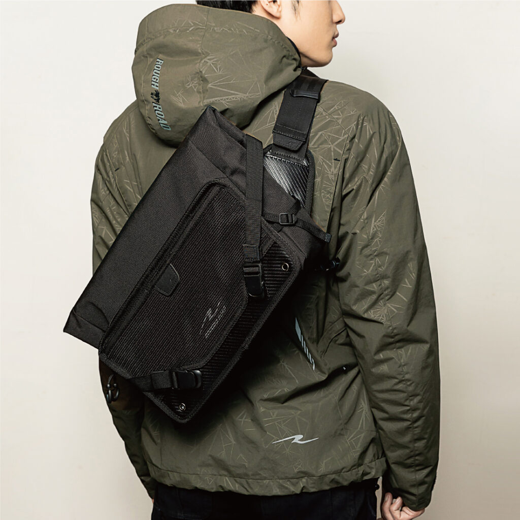 右掛け左掛け両用を考量したシンメトリー設計でユーザーを選ばず、メッシュポケットと大型ファスナーポケット(非防水)を備えた補強板入りフロントパネルをサイドのテンションベルトで調整することで、シルエットを崩すことなく荷物の増減に対応しバッグの安定感を高めます。