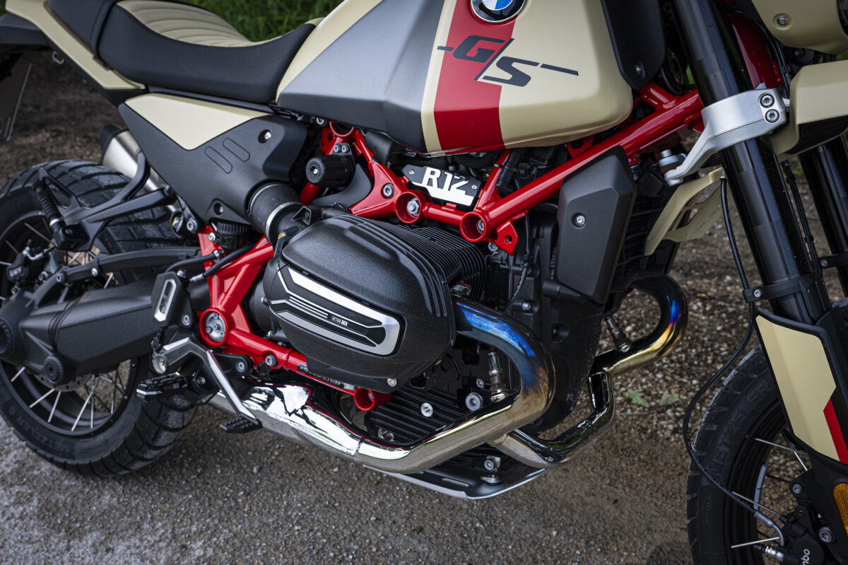 前置きが長くなってしましましたが、R 12 G/SはR 12 シリーズの派生モデルとして、オフロード性能にフォーカスして開発されています。その証拠に、フロントフォークは210mmのストロークを誇る専用の倒立フォークを採用、さらにリアサスペンションは200mmのストロークを持つ専用品を装備しています。ノーマルのR 12 nineTのサスペンションストロークは前140mm後ろ140mmなので、足周りの構成はまったく異なります。さらに、外装やマフラーなど各部の装備も専用品を採用。フレームはR 12シリーズをベースにしていますが、「足長化」したサスペンションに合わせて、ステアリングヘッド(フレーム前端部分)やサイドスタンド取り付け部など一部を変更しています。つまりR 12 G/Sは専用フレームを採用しているということになります。