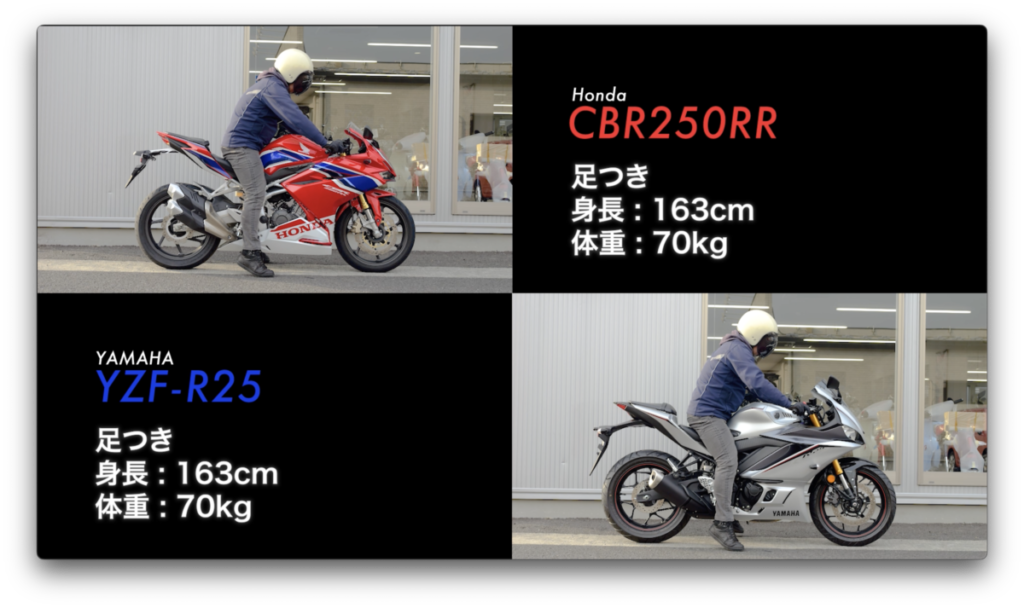 車重もCBR250RRが168kg、YZF-R25が169kgとほぼ同じ。