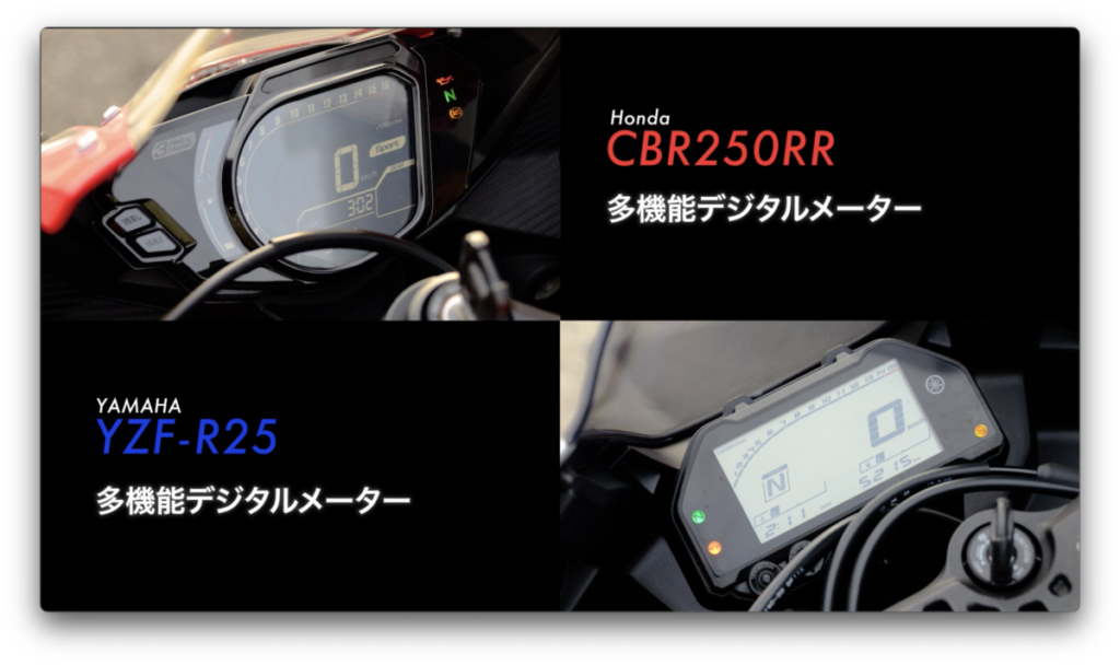 CBR250RR、YZF-R25ともに液晶表示のメーターを採用し、エンジン回転をバーグラフで表示するなどスポーティな雰囲気を高めてれる。