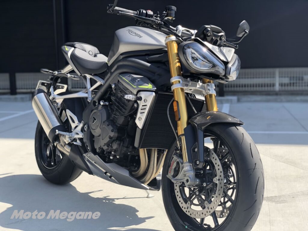サウンドも旧型よりも野太い。そのあたりも4気筒に近い音。トライアンフは全体的に気筒数に関係なくサウンドがとてもいい。旧型の高音ジェットサウンドも好きだったが腹に響く重厚感も心地よい。ロードスターシリーズの最高峰らしくワインディングは楽しい。前傾もゆるくはないがコンパクトな車体は意外と楽ちんに走ってこれる。ブレーキやサスペンションも最高クラスが装備されていてコーナーの操り感は走るほどにクセになっていく。うまく走れてしまうが奥も深い。ずっと楽しめる3気筒マシンだろう。