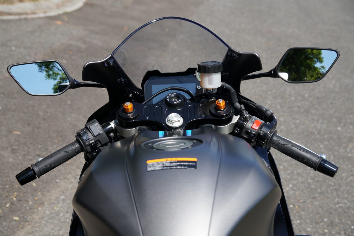 ポジションやデザインに反して意外と優しい印象。軽量な車体と相まって、機敏な動きで流れに乗れる。加速もスムーズ。ミドルクラスのSSで良くある、いつの間にかこんな速度が出てて焦るみたいなこともなかった。