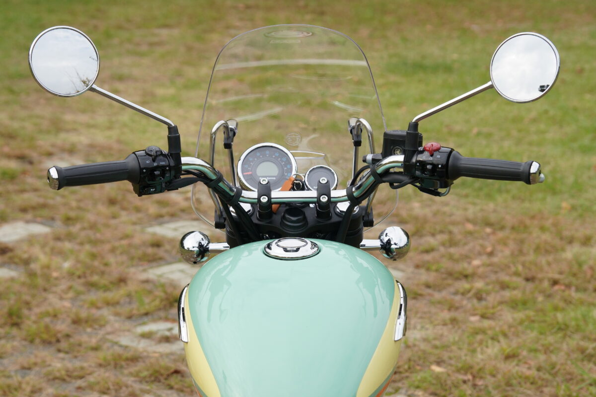 メテオ350は車重がやや重いものの、低重心設計のおかげで押し引きの負担が軽減され初心者にも扱いやすい。シート高の低さも安心感を高めてくれる。
