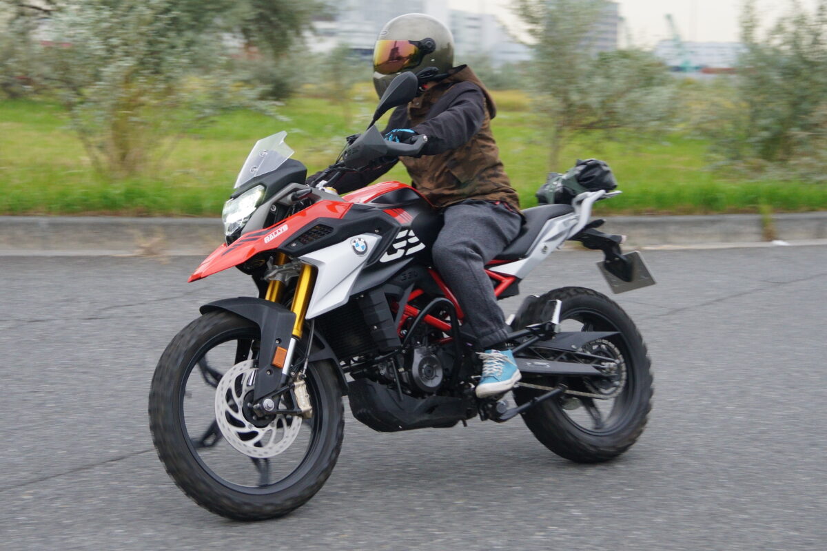 G310GSは軽量で、取り回しがしやすいモデルである。高めのハンドル位置も影響し、押し引きしやすい。ただし、サスペンションが柔らかく車体を立てると沈み込むため、サイドスタンドをしまうときには車体を垂直に立てスタンドが路面に引っかからないようにすることが必要。