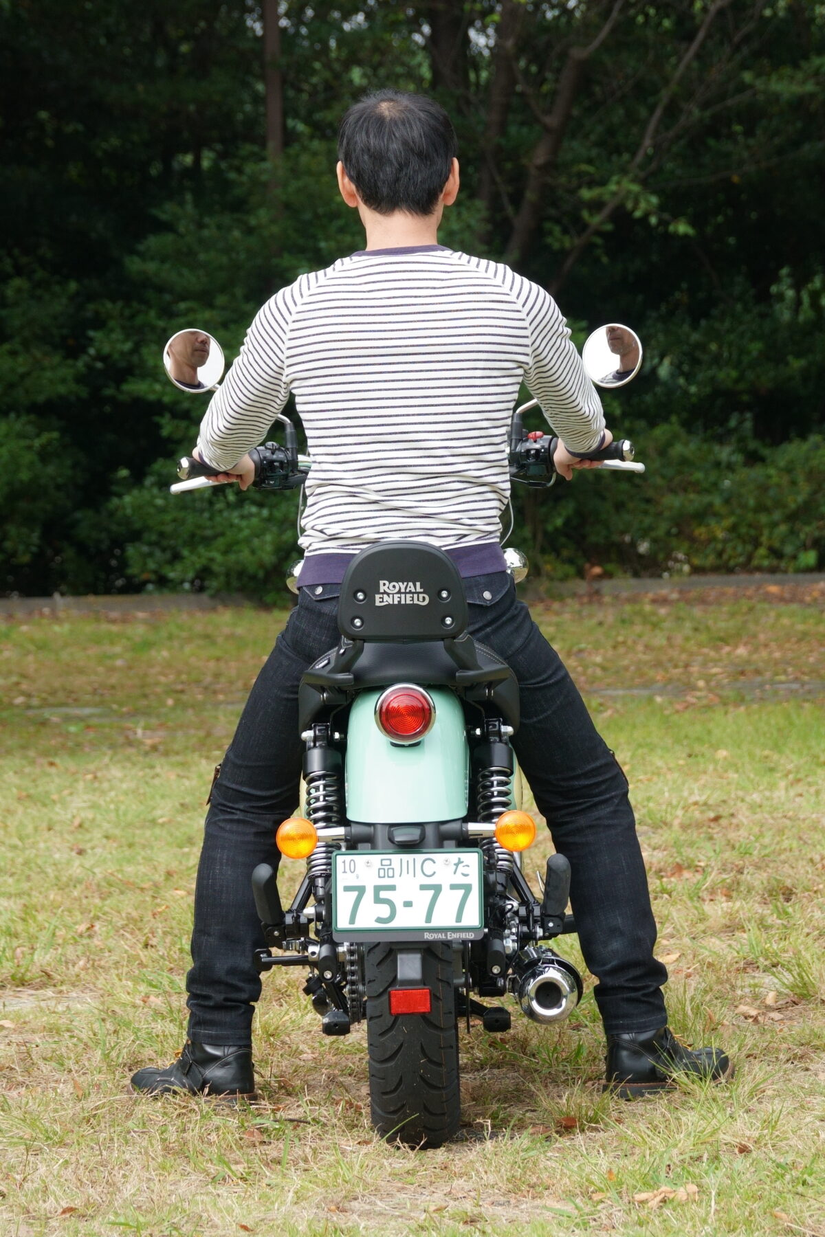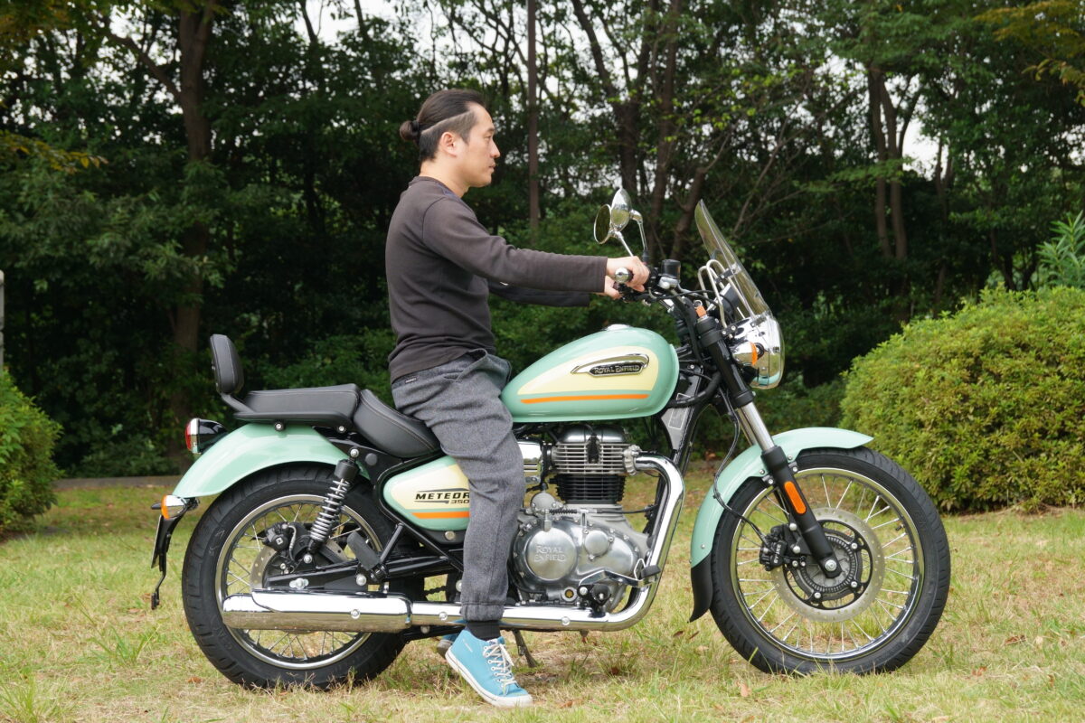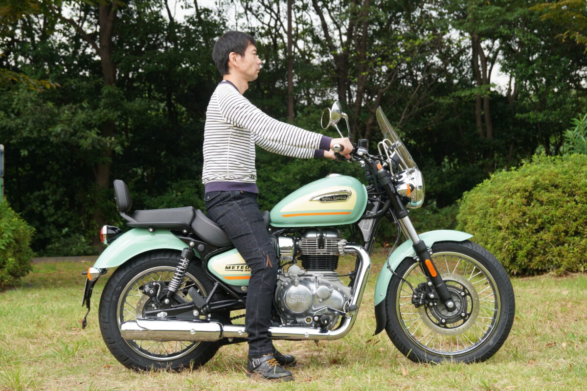 METEOR350のシート高は低めで、シート幅はやや広めの設計。足着きは良好だがシート幅が広いため、小柄なライダーだと足先だけが接地する程度となってしまう。しかし、低重心のため安定感があり、足着きに対する不安感は特に感じられなかった。女性からの人気が高いというのも納得!