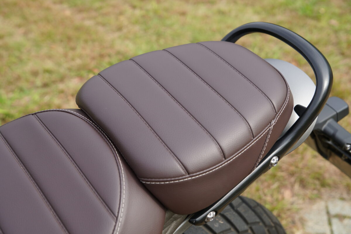 ライダー側と分かれているSCRAMBLER400Xのタンデムシート。座面はフラットで幅があり、グラブバーの形状と相まってタンデムもしやすい。