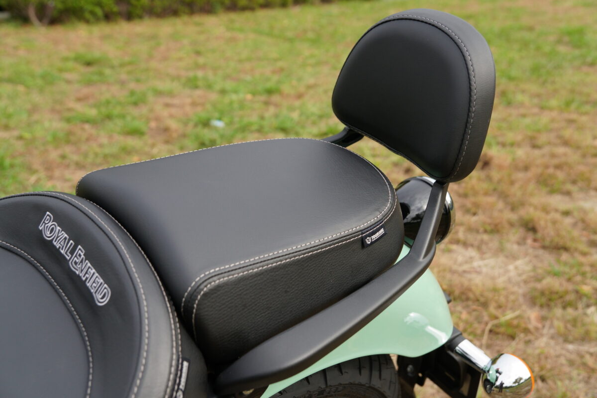 METEOR350はグラブバーが一体型になったバックレスト付きのため、タンデム側も安心してライディングを楽しめる。バイクになれていない人とタンデムするときはもちろん、荷物を積載するときにも便利だ。