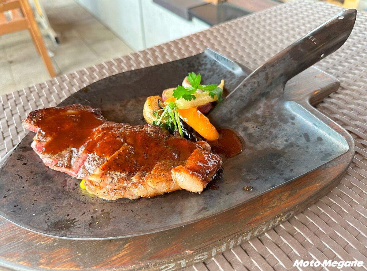 本物の剣先スコップを鉄板の代わりに使ったユニークな一品。しほろ牛は適度に脂ののった赤身肉で、噛むほどにしほろ牛の旨みを堪能できる。レアに焼かれた焼き加減が抜群で、やわらかな肉質でジューシーさのあるステーキは格別のおいしさだ。