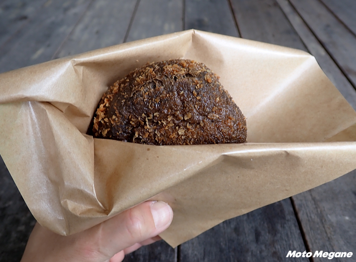チャレンジショップ「かきまるキッチン」で提供のカレーパン。竹炭パウダーが入っており、見た目は真っ黒。中にはプリッとした三陸産の牡蠣が2つ入っており、カレーとの相性が抜群。