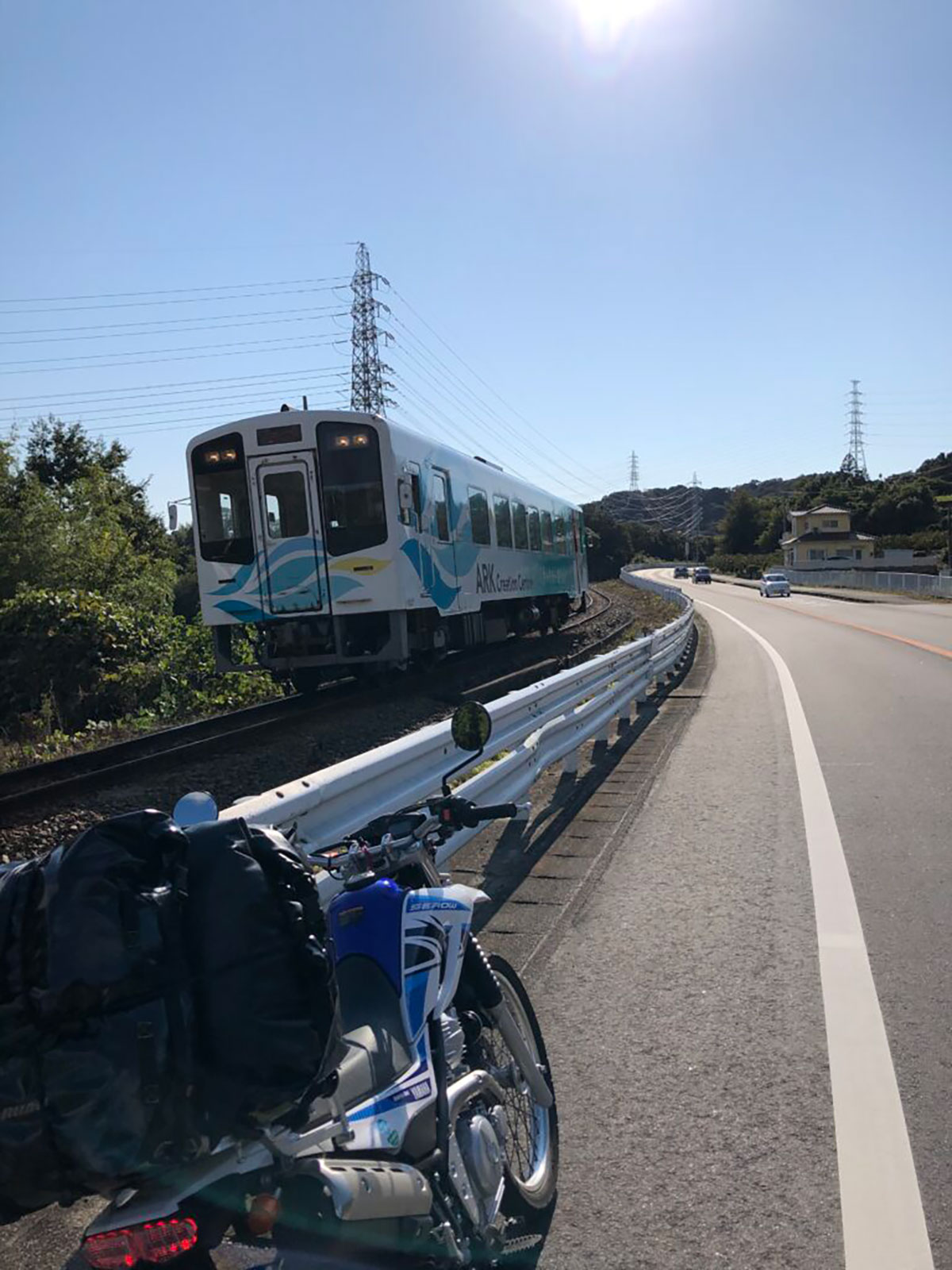 天浜線沿いに進んでいると途中で踏切の音が! 車両が来る! ということで、路肩に停車しやっと天浜線の運行車両を押えました♪