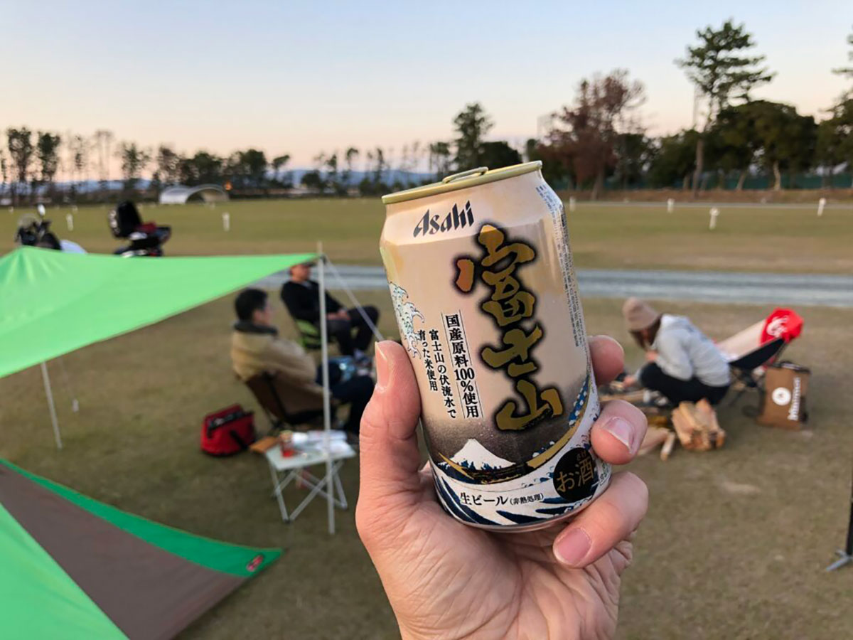 日没には何とか間に合い、テント設営よりもまずは乾杯しよう♪ とのこと。