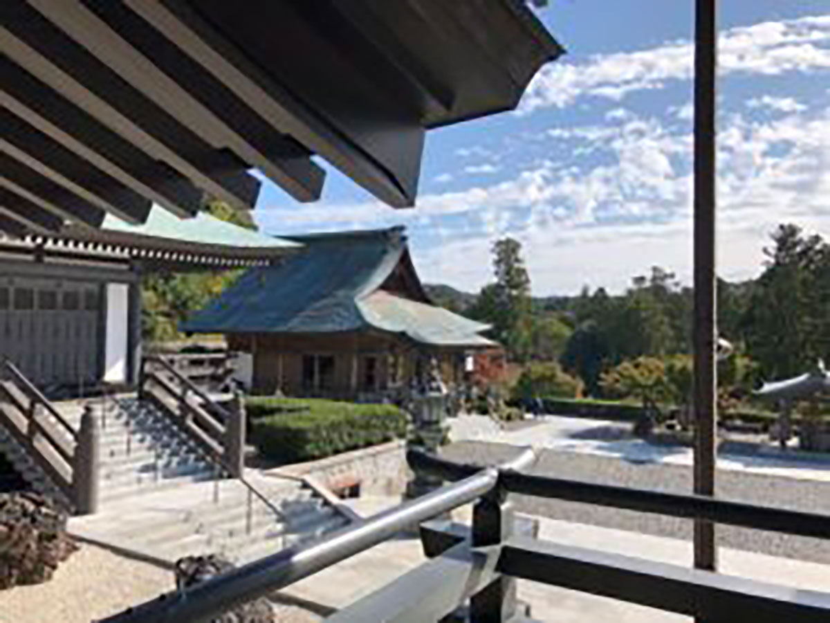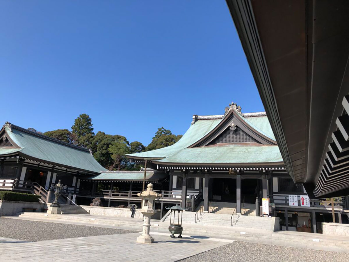 心臓破りの階段を登り切ると……クッキリパッキリした青空と豪華な本殿がお出迎え。遠州厄除けの総本山、その荘厳な雰囲気に緊張してお寺なのに神社式のお参りをしてしまった3人(爆)