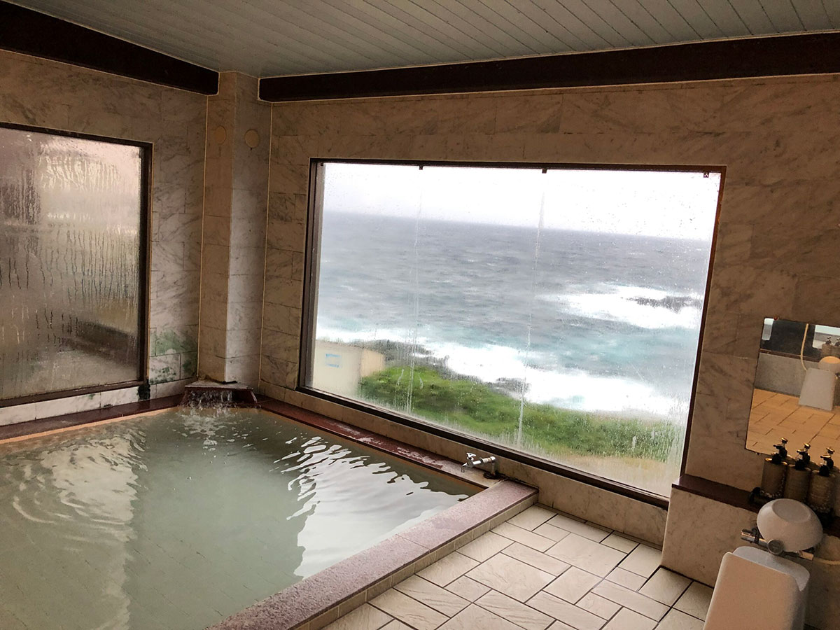 ここも晴れていれば最高の夕陽が見られるハズ。まあ、荒らぶる日本海を見ながら入るのもまた悪くないかなと♪ あったかい温泉に尖っていた気持ちが和らいでいくのを感じました……。